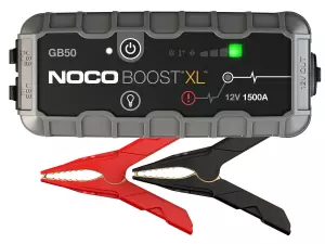 This portable lithium-ion battery jump starter pack delivers 1,500-amps for jump starting a dead battery in seconds. Also works as a portable power source for recharging USB devices like cellphones, tablets, etc. Be prepared for a dead battery with this NOCO battery jump starter.